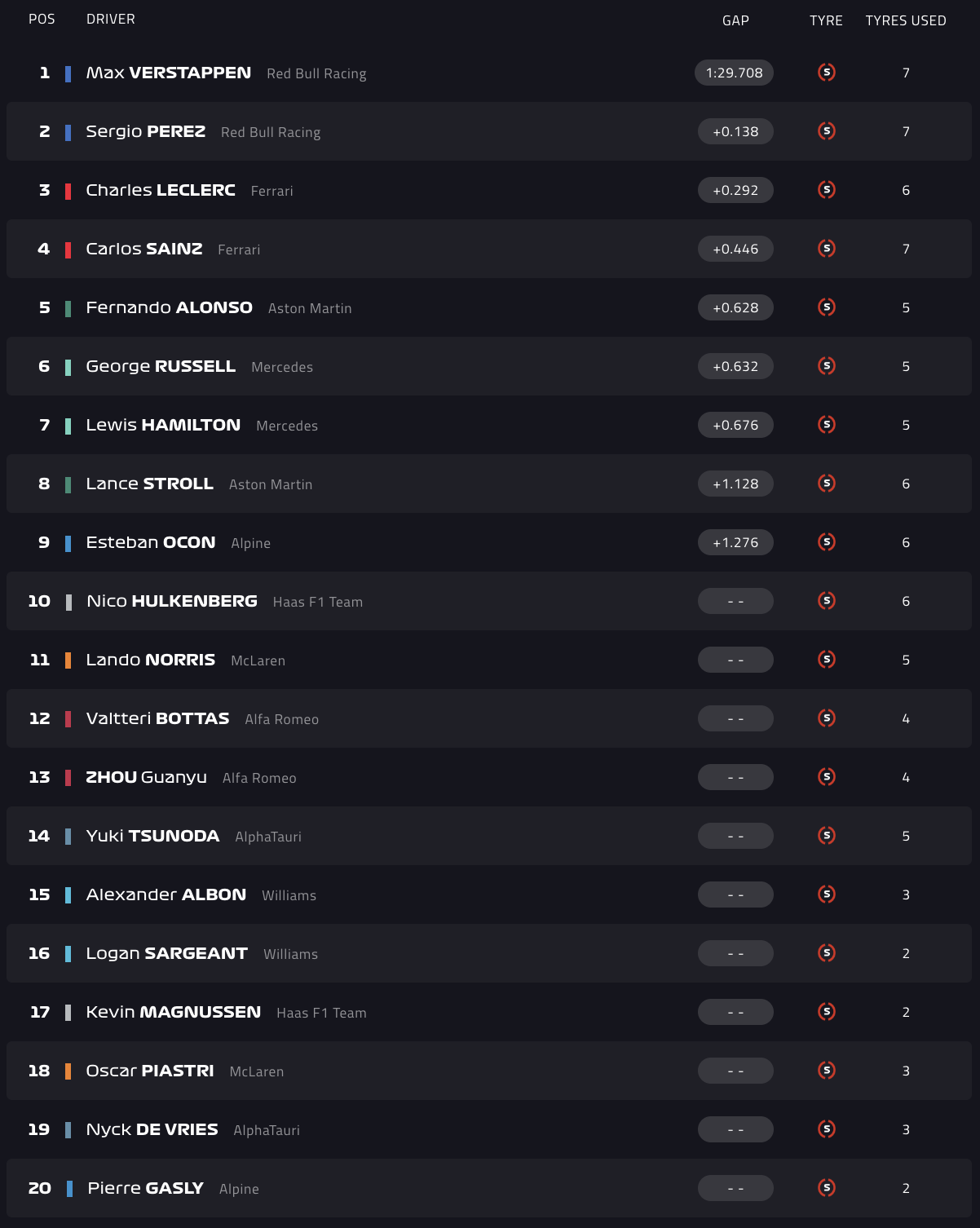 Πίσω τους θα βρίσκονται τα δύο μονοθέσια της Ferrari, καθώς ο Σαρλ Λεκλέρ ήταν τρίτος κάνοντας μόλις μία προσπάθεια προκειμένου να έχει ένα επιπλέον φρέσκο σετ την Κυριακή, και ο Κάρλος Σάινθ τέταρτος.