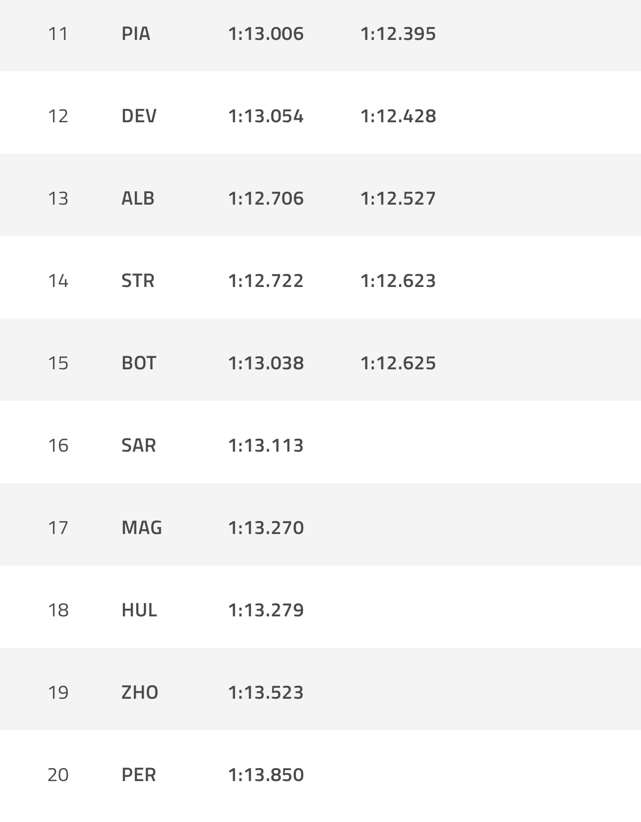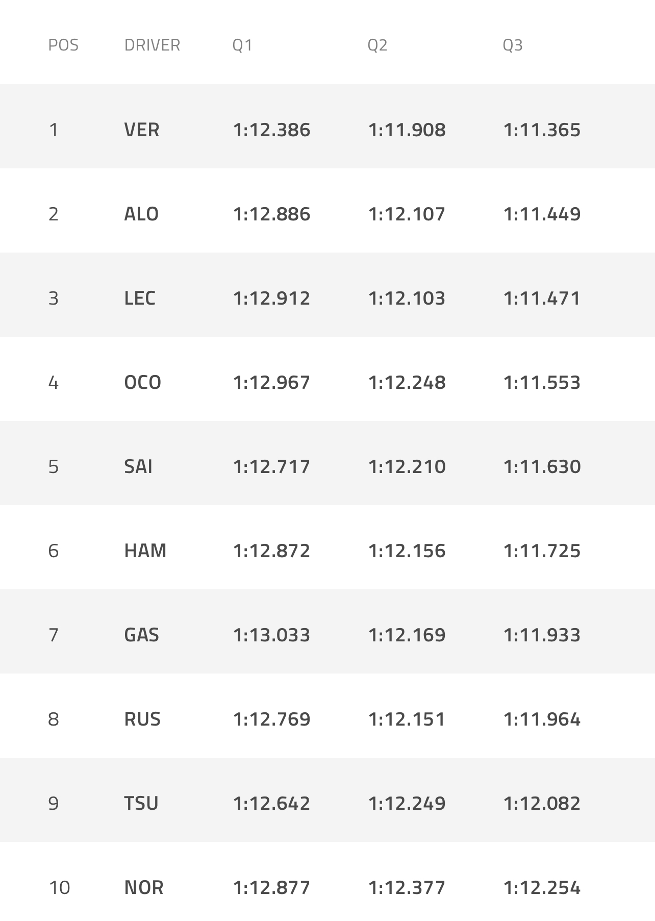 Την τριάδα συμπληρώνει ο Σαρλ Λεκλέρ, ενώ θετικό πρόσημο έχει η επίδοση του Εστεμπάν Οκόν ο οποίος με χρόνο 1:11.553 θα εκκινήσει από την τέταρτη θέση.