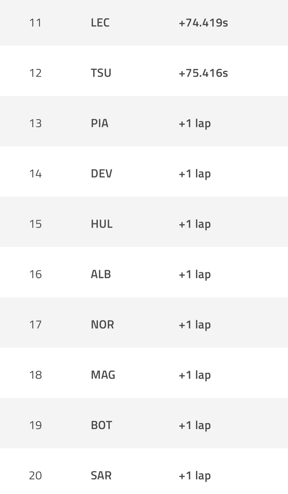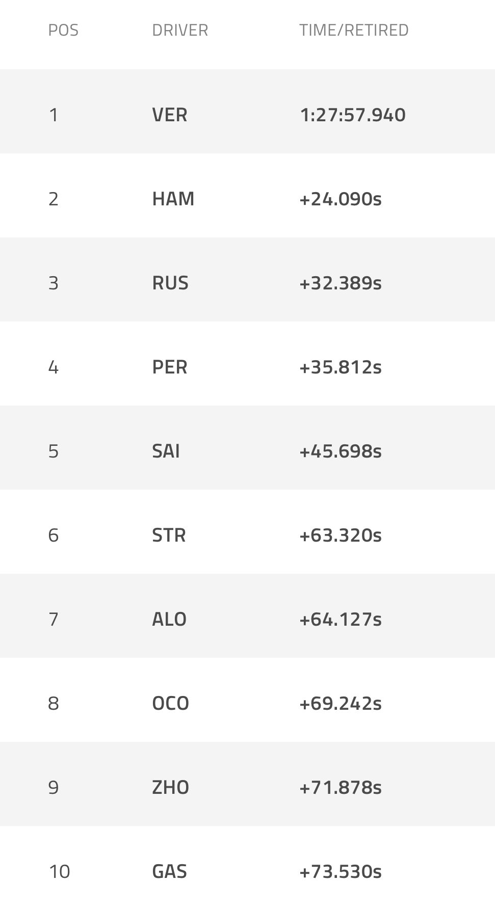 Πίσω του, με διαφορά μεγαλύτερη των 24 δευτερολέπτων, πλασαρίστηκε ο Λιούις Χάμιλτον, με τον Τζορτζ Ράσελ να τερματίζει τρίτος σε μια μέρα όπου η στρατηγική, η οδηγική ικανότητα και ο ρυθμός του μονοθεσίου απέδωσαν τα μέγιστα για τη Mercedes.