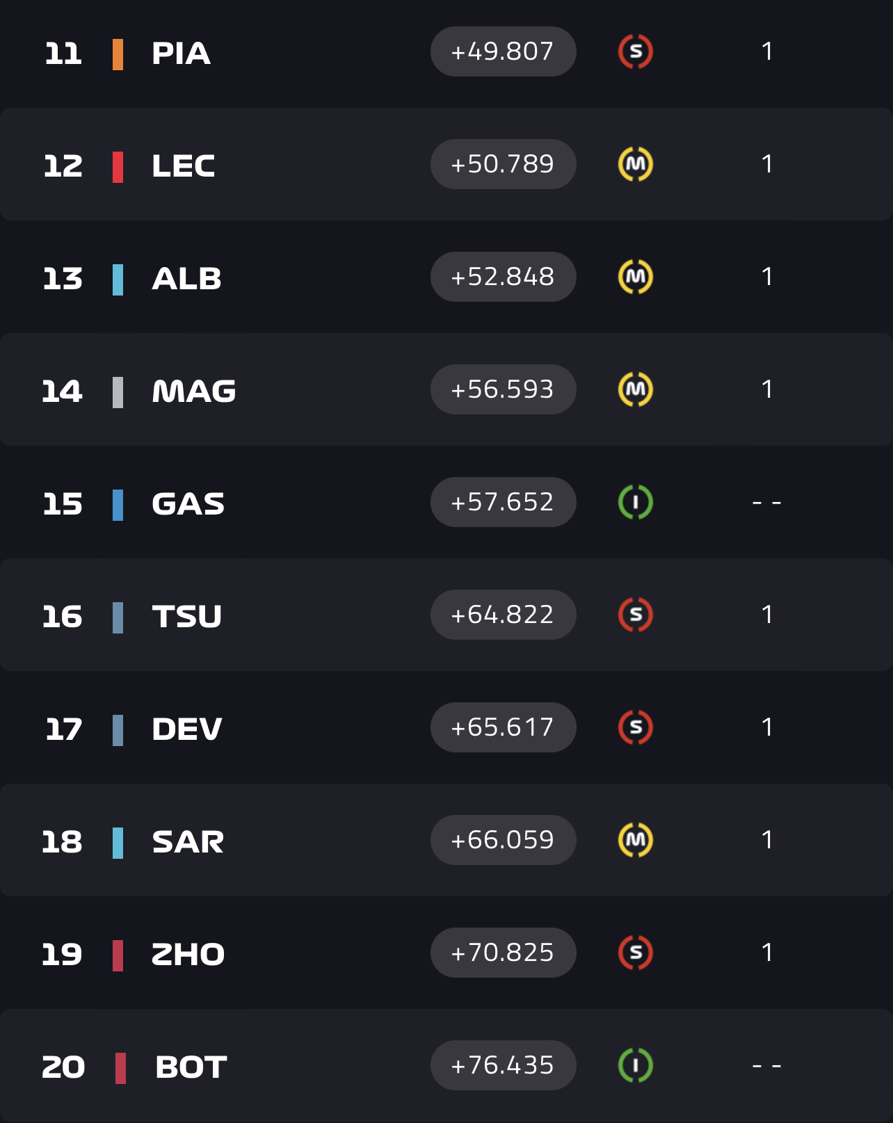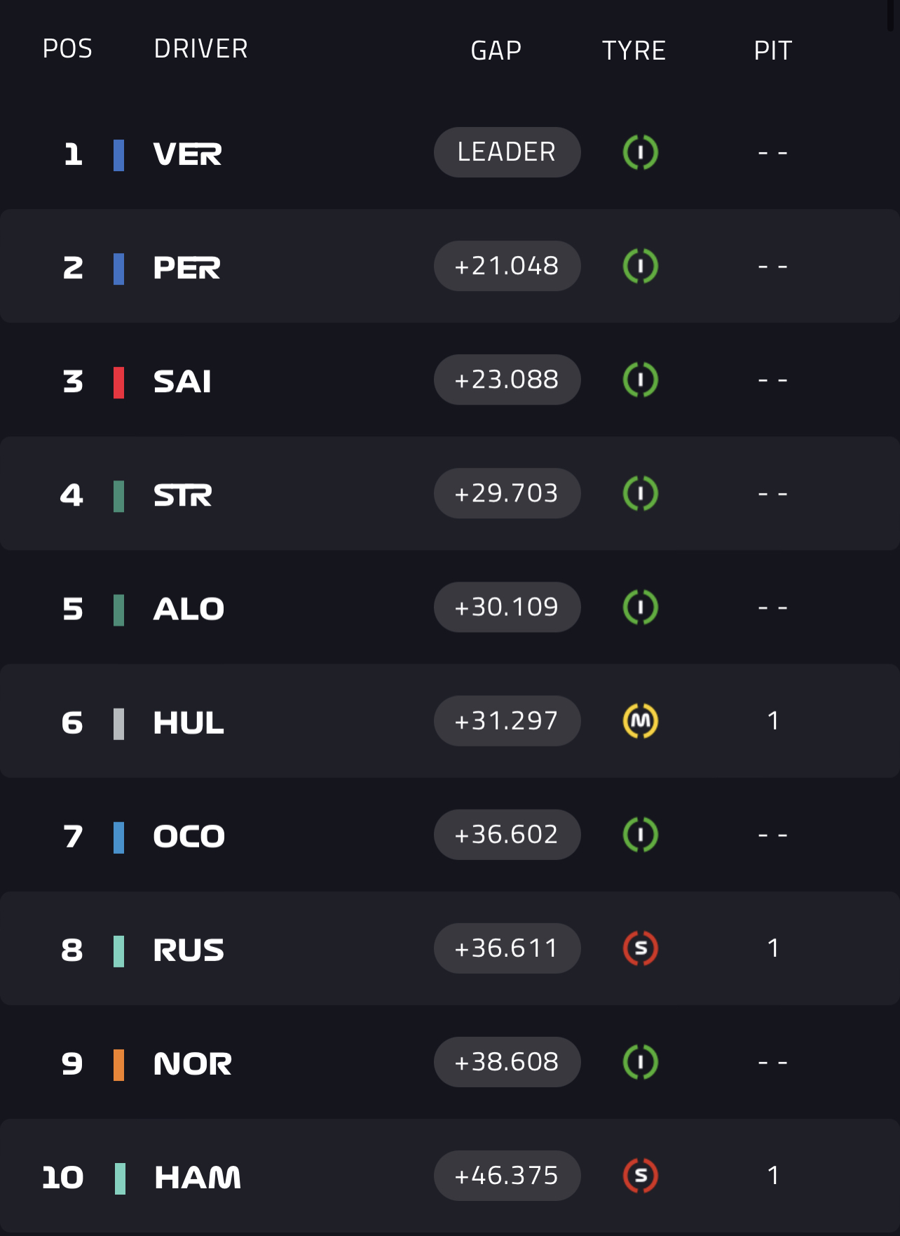 Πίσω του και έπειτα από μάχες διαρκείας για μια θέση στους βαθμούς, τερμάτισαν οι Σέρχιο Πέρες, Κάρλος Σάινθ καθώς επίσης και οι Aston Martin των Λανς Στρολ και Φερνάντο Αλόνσο που συμπληρώνουν την πρώτη 5άδα.
