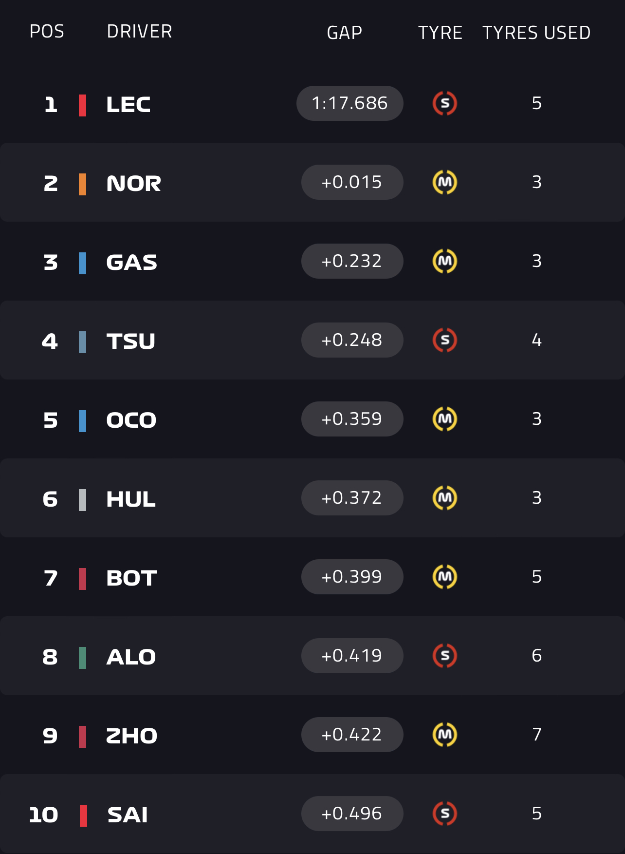 Ο Μονεγάσκος οδηγός της Ferrari σημείωσε χρόνο 1:17.686, με τον Λάντο Νόρις με McLaren και τον Πιέρ Γκασλί με Alpine να πλασάρονται στην δεύτερη και τρίτη θέση με 1:17.701 και 1:17.918 αντίστοιχα.