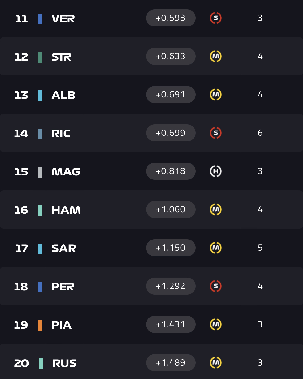 Την πεντάδα συμπληρώνουν οι Γιούκι Τσουνόντα και Εστεμπάν Οκόν, ενώ δέκατος, με 1:18.182, βρέθηκε ο Κάρλος Σάινθ. Οι πειραματισμοί και η προσομοίωση αγώνα άφησαν εκτός δεκάδας τις Mercedes των Λιούις Χάμιλτον και Τζορτζ Ράσελ, αλλά και τους Σέρχιο Πέρες και Μαξ Φερστάπεν, με τη Red Bull του Ολλανδού παγκόσμιου πρωταθλητή να γράφει τον 11ο ταχύτερο χρόνο με 1:18.279.