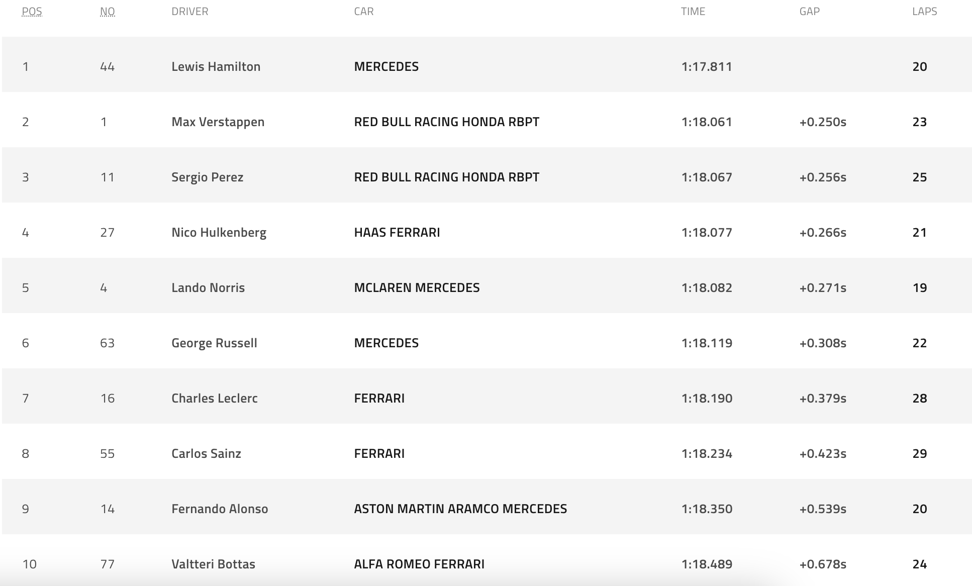 Ο 38χρονος Βρετανός ήταν ταχύτερος στην τρίτη περίοδο των κατατακτήριων με χρόνο 1:16.609, με τον Μαξ Φερστάπεν να ακολουθεί με διαφορά 3 χιλιοστών του δευτερολέπτου. Στο 3-4 βρέθηκαν οι McLaren των Λάντο Νόρις και Όσκαρ Πιάστρι, ενώ από την έκτη θέση θα δει σβήνουν τα πέντε φώτα της εκκίνησης, ο Σαρλ Λεκλέρ.
