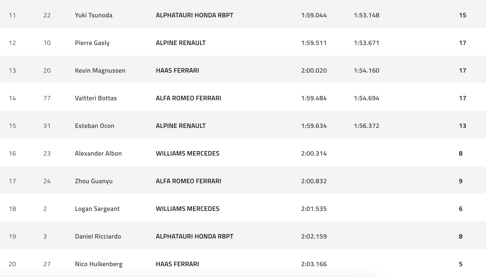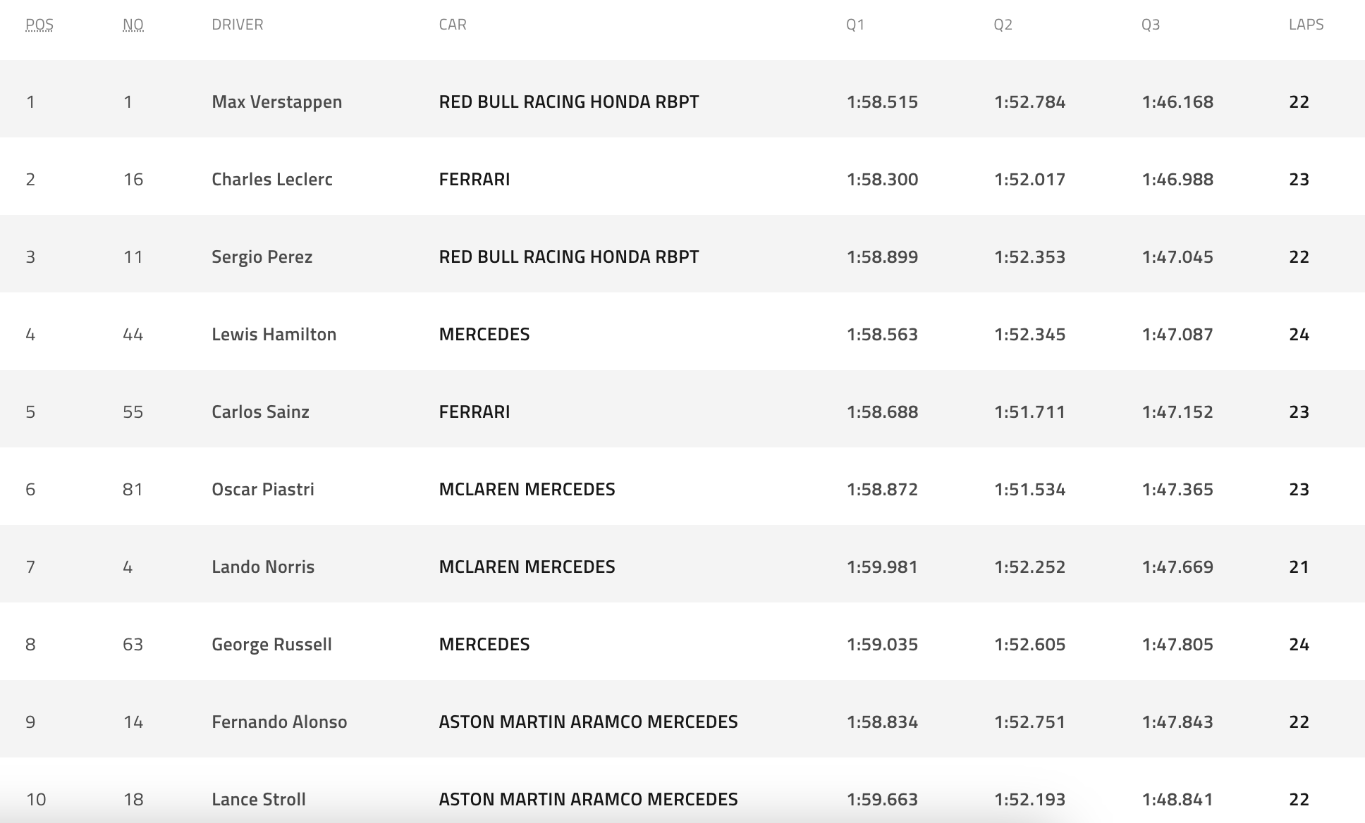 Τη δεκάδα συμπληρώνουν οι δύο McLaren των Όσκαρ Πιάστρι και Λάντο Νόρις, ακολουθούμενοι από τους Τζορτζ Ράσελ, Φερνάντο Αλόνσο και Λανς Στρολ.