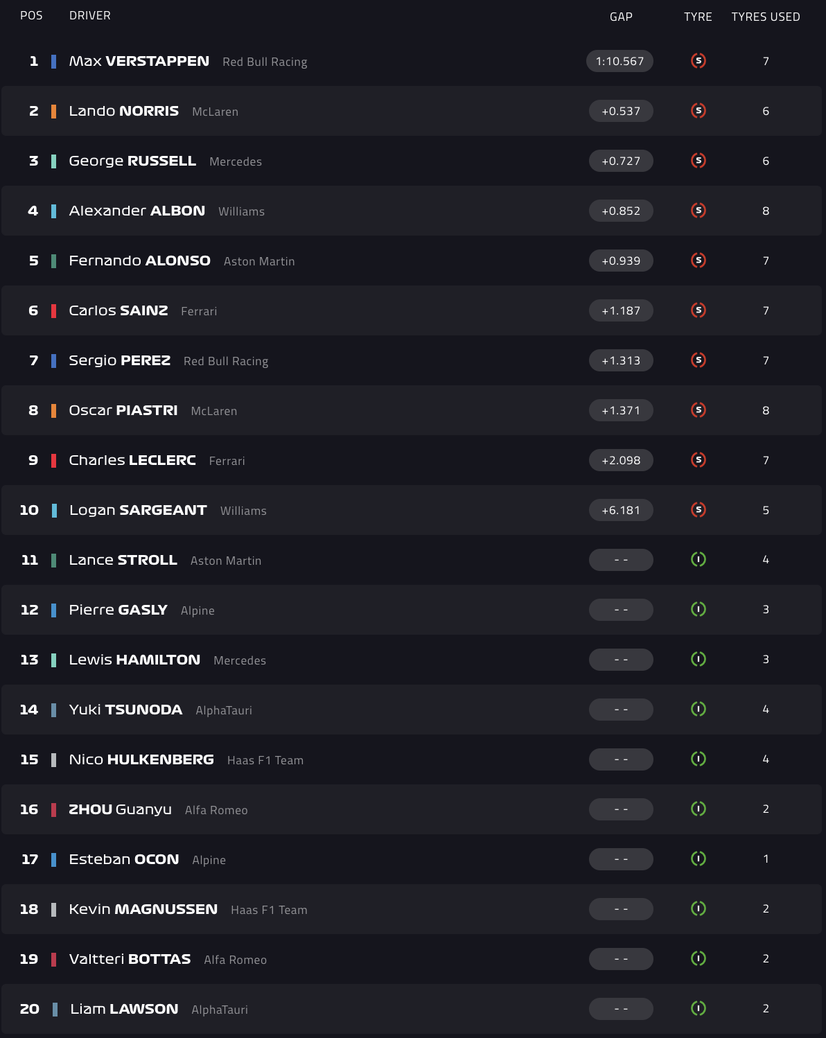 Ο Φερστάπεν είχε εν τέλει απόσταση άνω του μισού δευτερολέπτου από τους διώκτες του (1:10.567), με τον Λάντο Νόρις με McLaren να βρίσκεται την Κυριακή δίπλα του στην πρώτη σειρά της εκκίνησης, τον Τζορτζ Ράσελ με Mercedes να καταγράφει τον τρίτο καλύτερο χρόνο και τον Αλεξάντερ Άλμπον με Williams να κάνει την έκπληξη όντας 4ος.