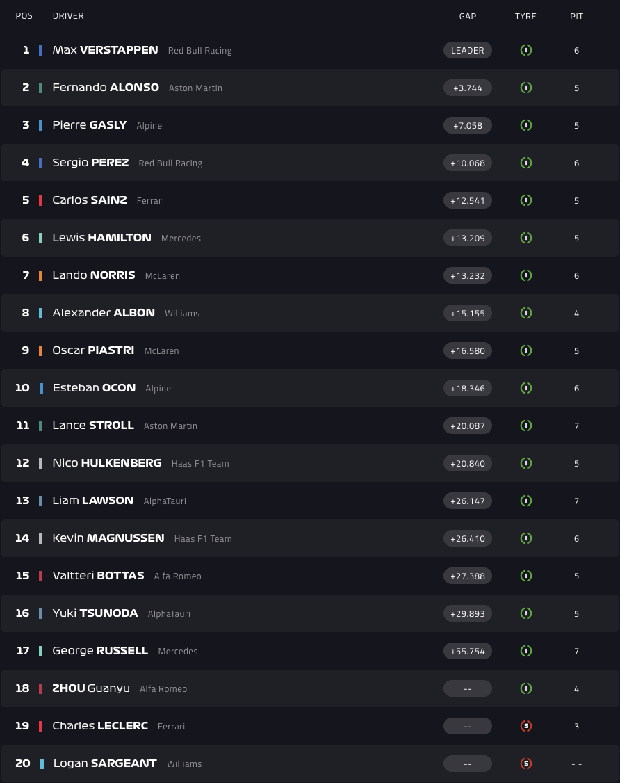 Δεύτερη θέση και επιστροφή στο βάθρο για τον εντυπωσιακό Φερνάντο Αλόνσο με Aston Martin, ενώ στο τρίτο σκαλί βρέθηκε ο Πιέρ Γκασλί, παίρνωντας τη θέση από τον Σέρχιο Πέρες, ο οποίος έλαβε ποινή πέντε δευτερολέπτων.