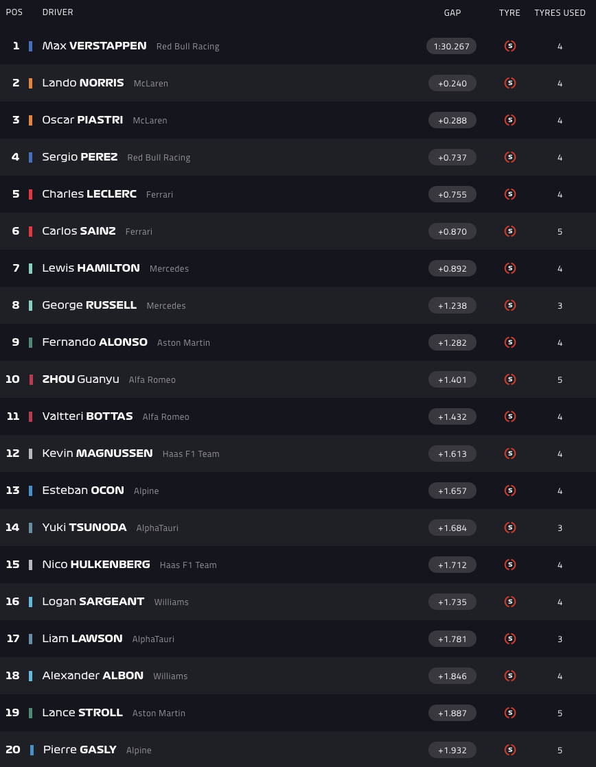 Σε μία διαδικασία χωρίς απρόοπτα, ο Ολλανδός δύο φορές παγκόσμιος πρωταθλητής πέτυχε το καλύτερο πέρασμα με 1:30.267, ενώ στις θέσεις 2 και 3 βρέθηκαν οι McLaren των Λάντο Νόρις (1:30.507) και Όσκαρ Πιάστρι (1:30.555).