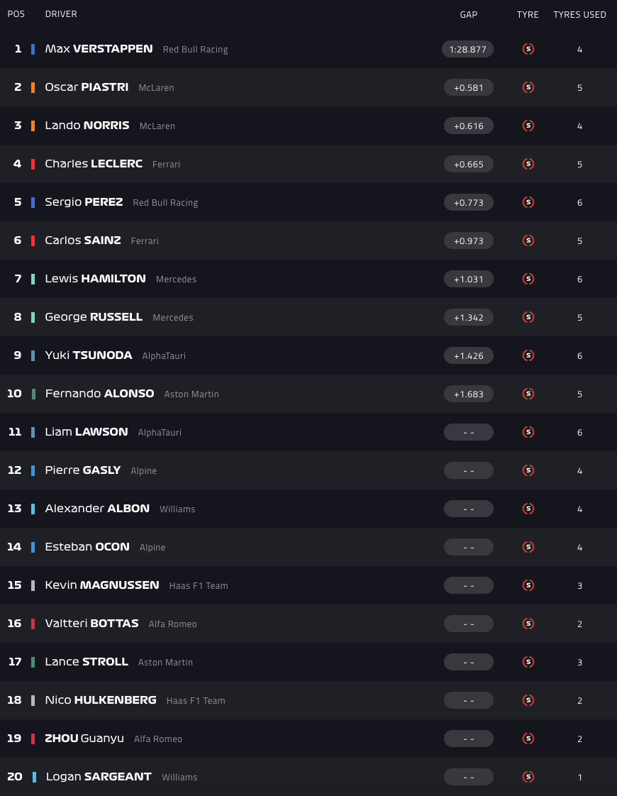 Ο παγκόσμιος πρωταθλητής έκανε χρόνο 1:28.877, με τον εντυπωσιακό rookie της McLaren, Όσκαρ Πιάστρι να πλασάρεται δεύτερος, με χρόνο 1:29.458 και τον ομόσταυλο του, Λάντο Νόρις να κλείνει την πρώτη τριάδα με 1:29.493.