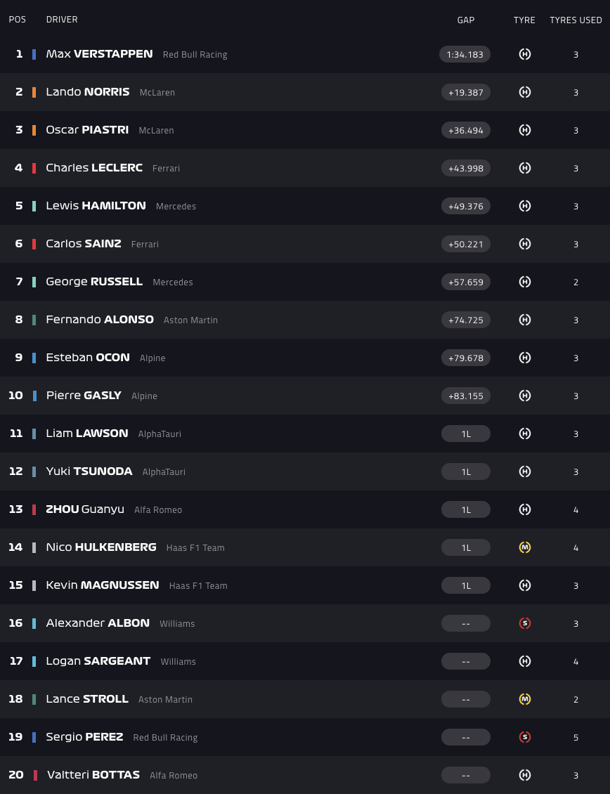 Ο Ολλανδός πέρασε πρώτος τη γραμμή εκκίνησης τερματισμού, έχοντας κατοχυρώσει και τον βαθμό του ταχύτερου γύρου, με τους Λάντο Νόρις και Όσκαρ Πιάστρι να καταλαμβάνουν τις υπόλοιπες θέσεις του βάθρου, πετυχαίνοντας το 2-3 για τη McLaren.