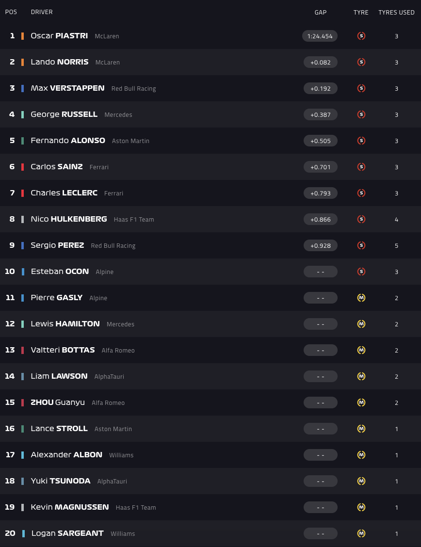 Ο 22χρονος Αυστραλός σημείωσε ταχύτερο πέρασμα με 1:24.454, με τον teammate του στη McLaren να ακολουθεί και τον δύο φορές παγκόσμιο πρωταθλητή της Red Bull, Μαξ Φερστάπεν, να πλασάρεται τρίτος.