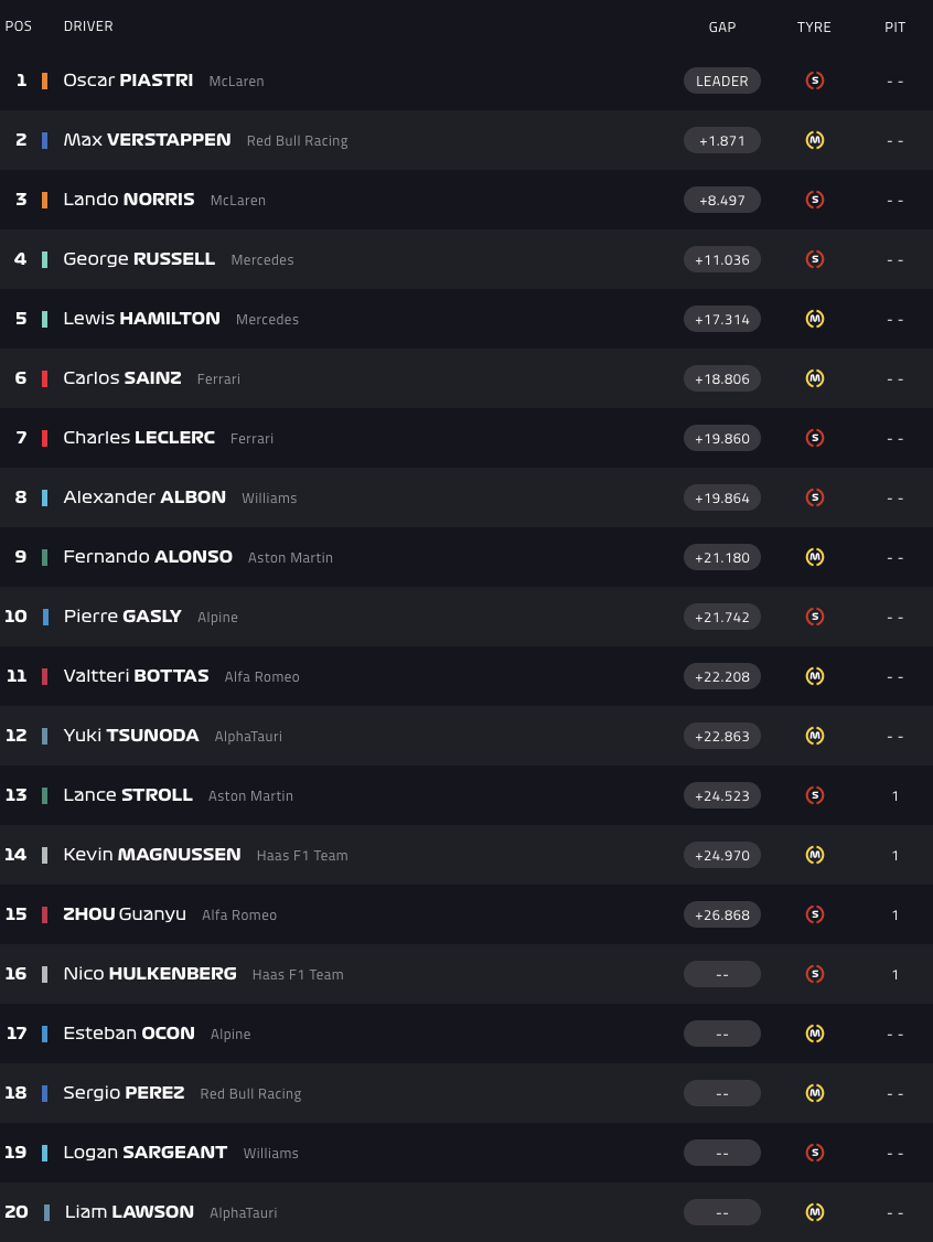 Στην τρίτη θέση πλασαρίστηκε ο Λάντο Νόρις, με τους Τζορτζ Ράσελ και Λιούις Χάμιλτον να κλείνουν την πρώτη πεντάδα.