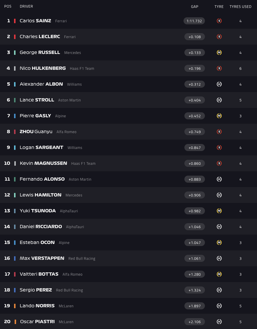 Ο Ισπανός σημείωσε 1:11.732, με τον teammate του, Σαρλ Λεκλέρ να ακολουθεί με medium και χρόνο 1:11.840 και τον Τζορτζ Ράσελ να έχει το τρίτο ταχύτερο πέρασμα της διαδικασίας με 1:11.865.