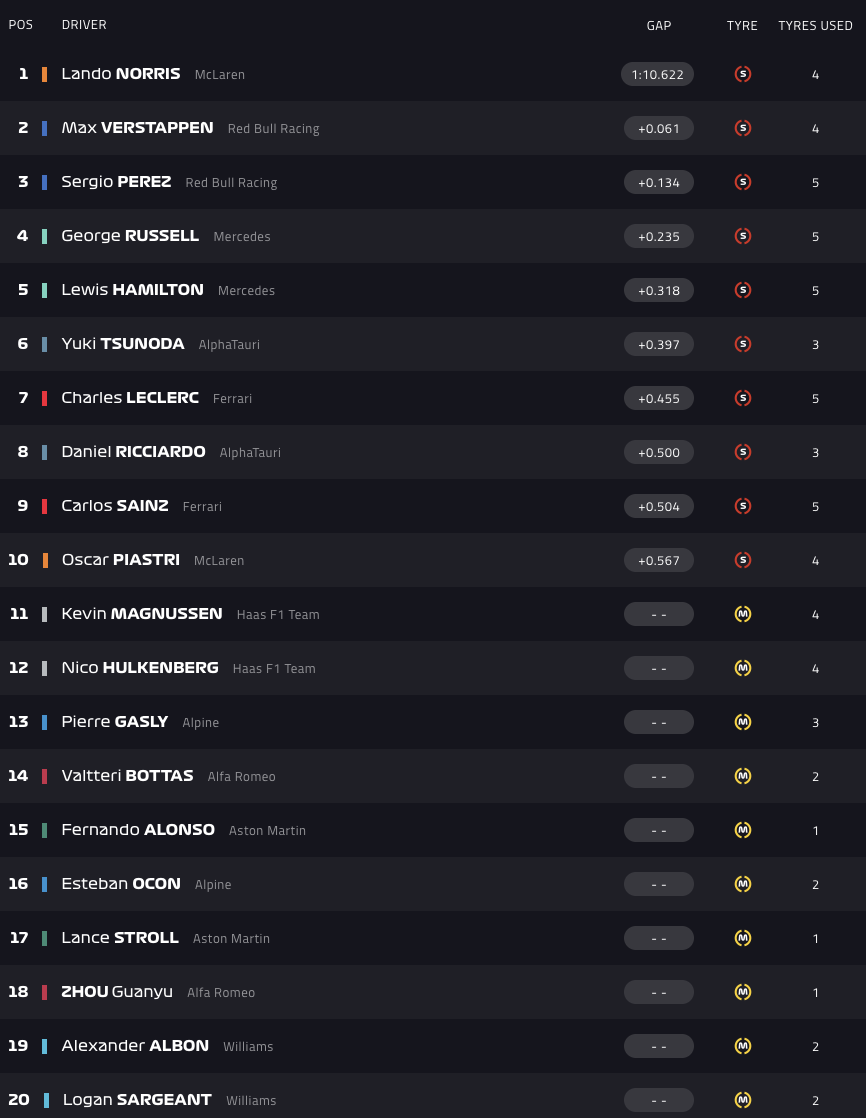 Ο Βρετανός πιλότος της McLaren σημείωσε χρόνο 1:10.622, αφήνοντας πίσω του τις Red Bull των Μαξ Φερστάπεν και Σέρχιο Πέρες. Εκτός ρυθμού ήταν η Mecredes, με τους Τζορτζ Ράσελ και Λιούις Χάμιλτον να πλασάρονται στο 4-5, αλλά και η Ferrari, που είδε τους Σαρλ Λεκλέρ και Κάρλος Σάινθ να καταλαμβάνουν τις θέσεις 7 και 9.