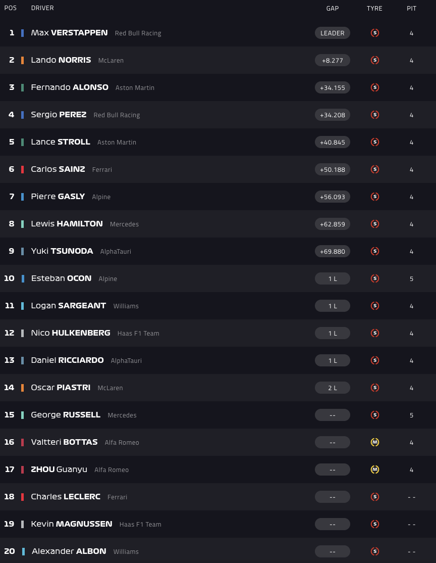 Δεύτερος, έχοντας εξαιρετική εκκίνηση, τερμάτισε ο Λάντο Νόρις με McLaren, ενώ η Aston Martin επέστρεψε στα θετικά αποτελέσματα, με τον Φερνάντο Αλόνσο να καταλαμβάνει το τρίτο σκαλί του βάθρου, μετά από έντονη μάχη που έδωσε με τον Σέρχιο Πέρες στους τελευταίους γύρους και τον Λανς Στρολ να πλασάρεται πίσω τους, συμπληρώνοντας την πρώτη πεντάδα.