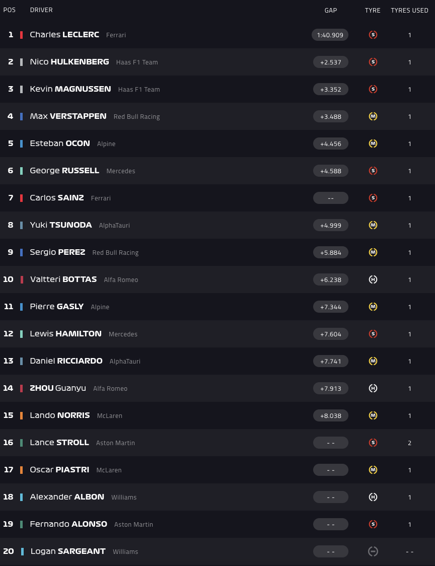 Λίγα λεπτά αργότερα, οι αγωνοδίκες αποφάσισαν την οριστική διακοπή του FP1, αφού έπρεπε να επανατοποθετηθεί το κάλυμμα του φρεατίου και να ελεγχθεί εκ νέου η πίστα. Στην κορυφή των χρόνων του ολιγόλεπτου FP1 βρέθηκε ο Σαρλ Λεκλέρ με 1:40.909.