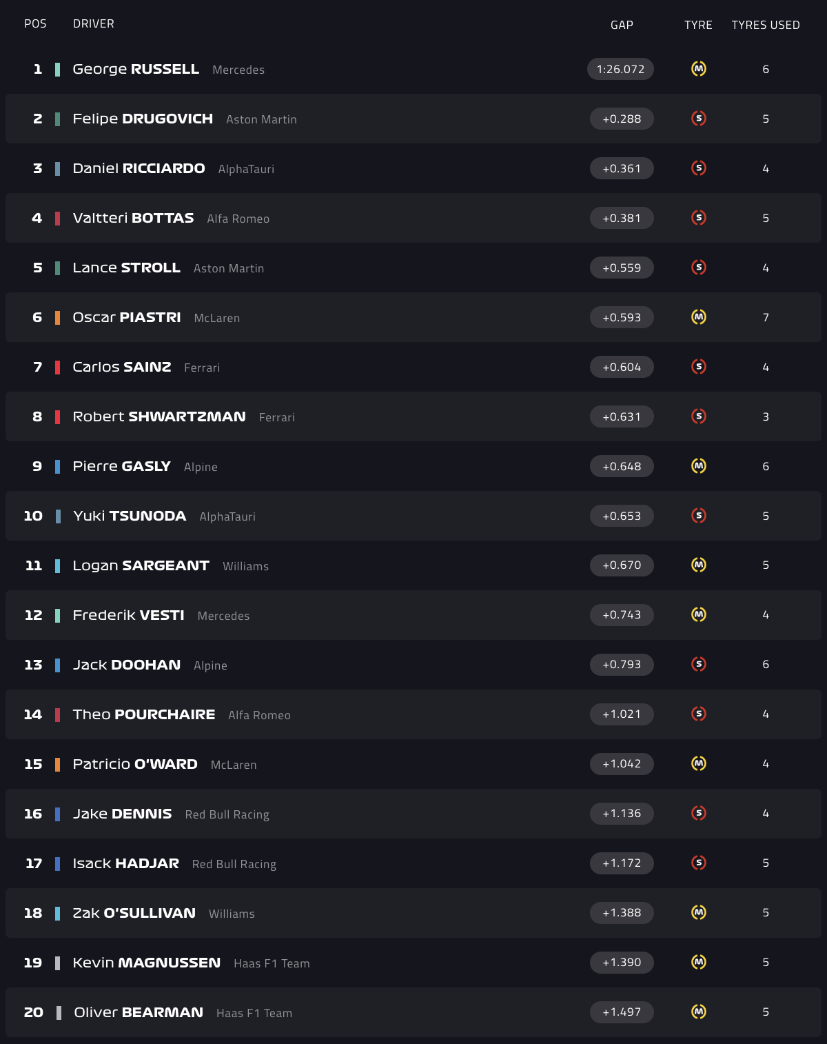 Ο Βρετανός έκανε 1:26.072, με τον δοκιμαστή της Aston Martin, Φελίπε Ντρούγκοβιτς να ακολουθεί στη δεύτερη θέση και τον Ντάνιελ Ρικάρντο με AlphaTauri να κλείνει την πρώτη τριάδα.