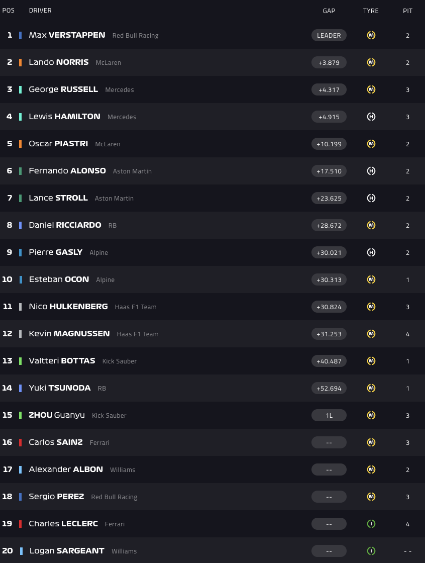Το πρώτο αυτοκίνητο ασφαλείας βγήκε την κατάλληλη στιγμή για τον Ολλανδό πιλότο της Red Bull, ο οποίος μετά τα pit stops βρέθηκε μπροστά από τον -έως τότε- πρωτοπόρο Λάντο Νόρις, αφήνοντάς τον στη δεύτερη θέση. Τρίτος, μετά από μονομαχίες στον τελευταίο γύρο με τον Λιούις Χάμιλτον, πλασαρίστηκε ο poleman, Τζορτζ Ράσελ, βάζοντας την Mercedes στο podium για πρώτη φορά φέτος.
