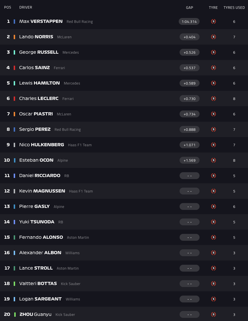 Ο 26χρονος πιλότος της Red Bull ήταν ταχύτερος στο Q3 με 1:04.314, επίδοση που δεν κατάφερε να ξεπεράσει με τη McLaren του ο Λάντο Νόρις (1:04.718), με αποτέλεσμα να πλασαριστεί δεύτερος. Τζορτζ Ράσελ και Κάρλος Σάινθ θα παραταχθούν στις θέσεις 3 και 4, με τους teammates τους σε Mercedes και Ferrari, Λιούις Χάμιλτον και Σαρλ Λεκλέρ, να ακολουθούν.