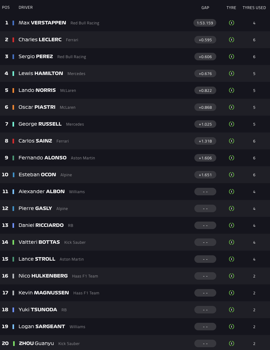 Λιούις Χάμιλτον και Λάντο Νόρις ακολουθούν, ενώ το 1:54.027 που σημείωσε ο νικητής του Grand Prix της Ουγγαρίας, Όσκαρ Πιάστρι, τον φέρνει μπροστά από τους Τζορτζ Ράσελ και Κάρλος Σάινθ.