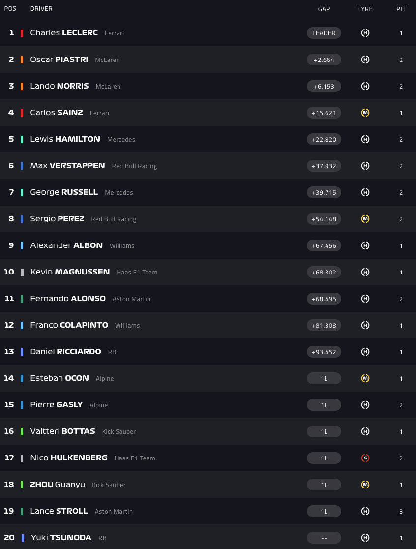 Παρά την εξαιρετική τους εκκίνηση, η McLaren είδε τους Όσκαρ Πιάστρι και Λάντο Νόρις να τερματίζουν στις θέσεις 2 και 3, με τον Αυστραλό να προσπερνάει υποδειγματικά τον teammate του, ο οποίος εκκινούσε από την pole position.