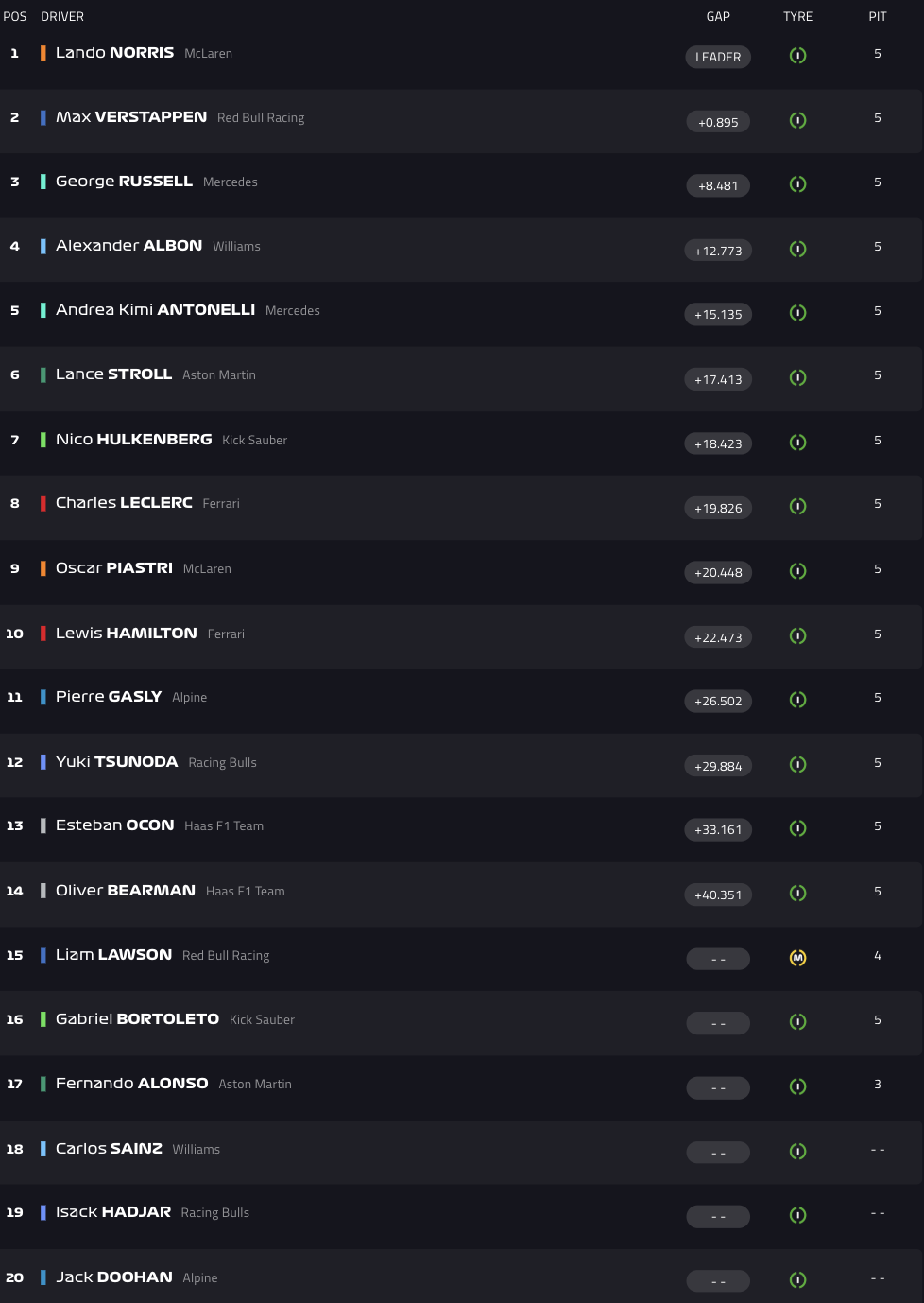 Παρά το γεγονός ότι στους δύο τελευταίους γύρους βρισκόταν εντός ζώνης DRS του Βρετανού, ο Μαξ Φερστάπεν δεν κατάφερε να επικρατήσει του ρυθμού της McLaren και τερμάτισε δεύτερος. Τρίτος, μπροστά από τον Αλεξάντερ Άλμπον, πλασαρίστηκε ο Τζορτζ Ράσελ, με τον teammate του στην Mercedes, Αντρέα Κίμι Αντονέλι, να ολοκληρώνει εντυπωσιακά το ντεμπούτο του στην 5η θέση, σε έναν αγώνα που ζόρισε αρκετά τους υπόλοιπους rookies του grid.