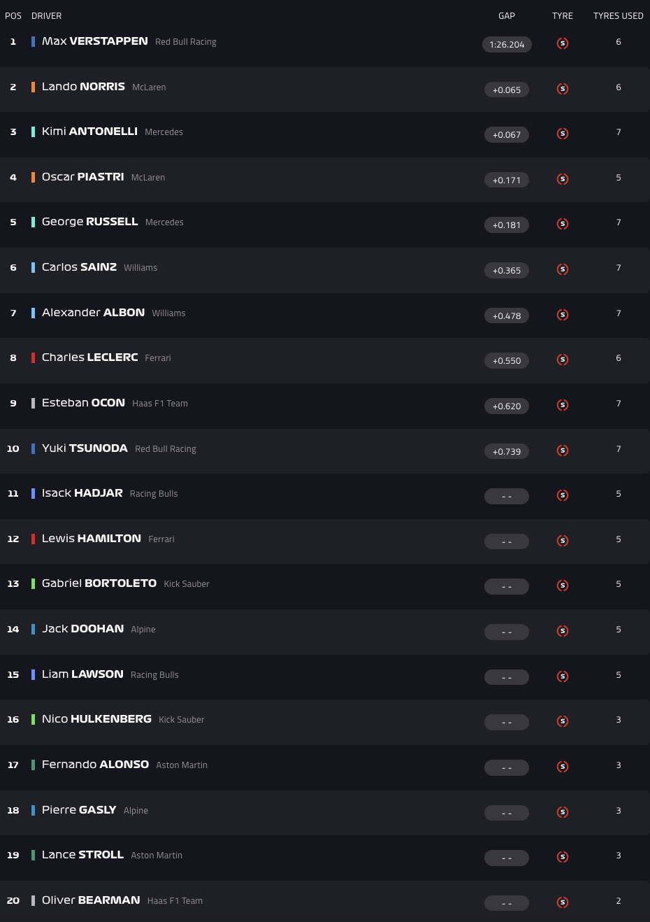 Παρά την υπερστοφή της RB21 στην πρώτη στροφή, ο Ολλανδός κατάφερε να σημειώσει χρόνο 1:26.204, αφήνοντας στη δεύτερη θέση τον Λάντο Νόρις, ο οποίος έφτασε στα όριά της την McLaren του, σημειώνοντας επίδοση 1:26.269. Τρίτος, μπροστά από τον Όσκαρ Πιάστρι, πλασαρίστηκε ο 18χρονος Ιταλός της Mercedes, Αντρέα Κίμι Αντονέλι, με 1:26.271.