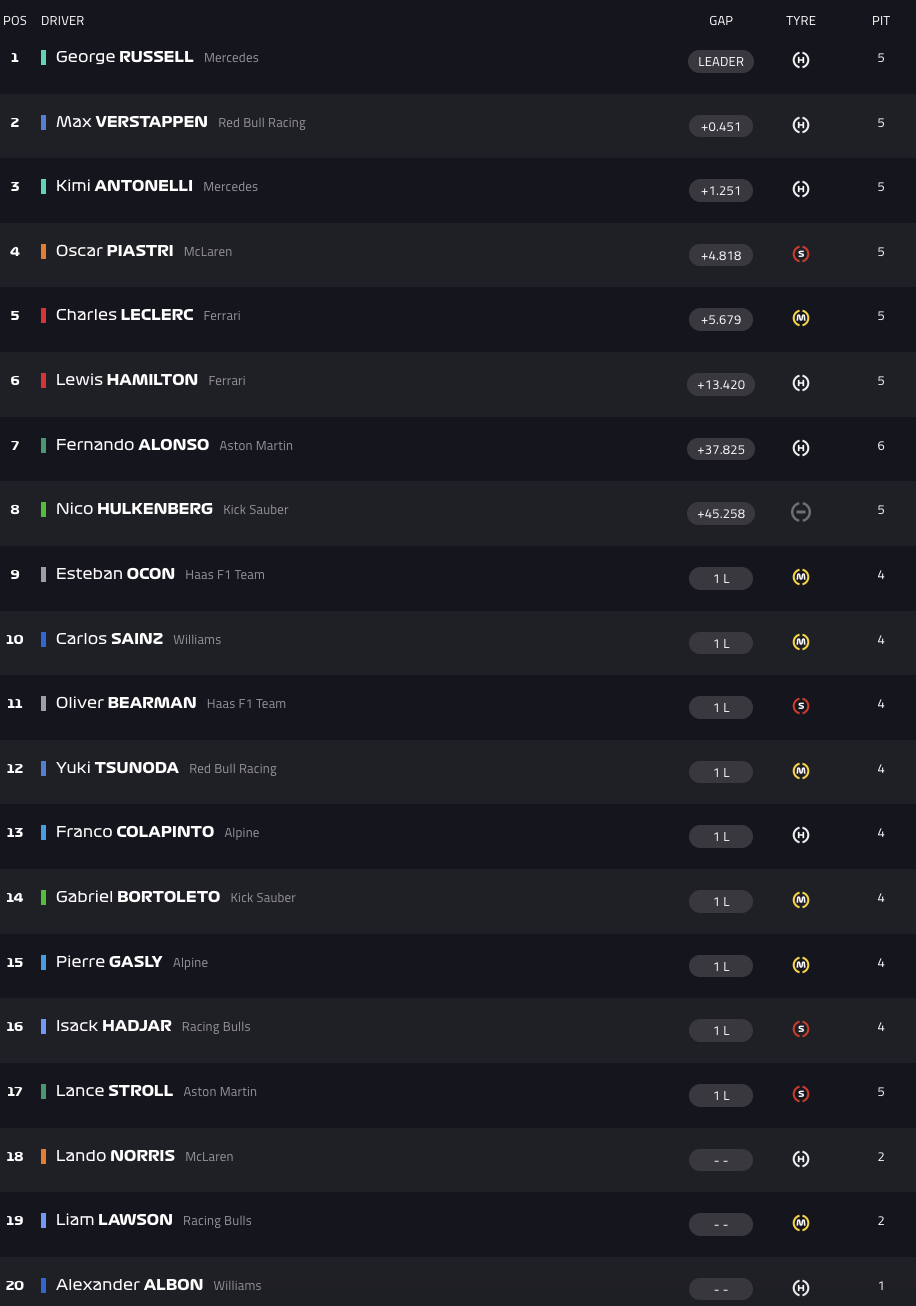 Στο 5-6 πλασαρίστηκαν οι Σαρλ Λεκλέρ και Λιούις Χάμιλτον, με τον Μονεγάσκο να αμφισβητεί τις επιλογές στρατηγικής της Ferrari και τον επτά φορές παγκόσμιο πρωταθλητή να παραπονιέται και πάλι για τον ρυθμό της SF-25.