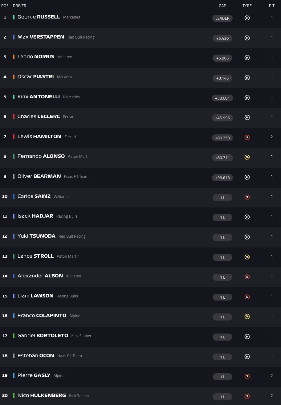 Ο Πιάστρι εξέφρασε παράπονα για τον teammate του στο team radio της McLaren μετά την επαφή των δύο MCL39, και όντας εκνευρισμένος και απογοητευμένος πέρασε τέταρτος την γραμμή του τερματισμού. Πέμπτος, πετυχαίνοντας μια απαιτητική προσπέραση στον Σαρλ Λεκλέρ, πλασαρίστηκε ο rookie της Mercedes, Αντρέα Κίμι Αντονέλι, την ίδια στιγμή που ο Λιούις Χάμιλτον έκανε το 6-7 για τη Ferrari.