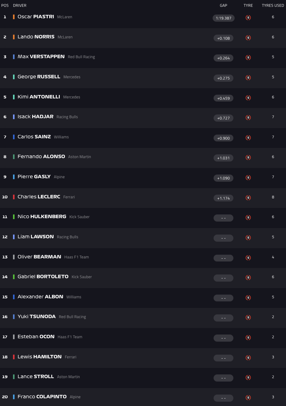 Στην τελευταία του προσπάθεια, ο Πιάστρι έγραψε 1:19.387, χρόνος που άφησε δεύτερο τον teammate του στην McLaren και πρωτοπόρο της κατάταξης, ο οποίος εγκατέλειψε, μετά από λάθος του, τον γρήγορο γύρο του και έμεινε πίσω από τον 24χρονο, με επίδοση 1:19.495. Τρίτος θα εκκινήσει τον αγώνα ο τετράκις παγκόσμιος πρωταθλητής της Formula 1, Μαξ Φερστάπεν, με τον Τζορτζ Ράσελ να ακολουθεί στην τέταρτη θέση, μπροστά από τον ομόσταβλό του, Αντρέα Κίμι Αντονέλι.